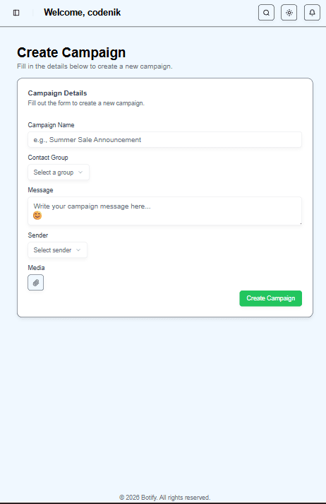 Once confirmed, log in to your dashboard, create your user profile, and connect the WhatsApp number you want to use for sending messages.